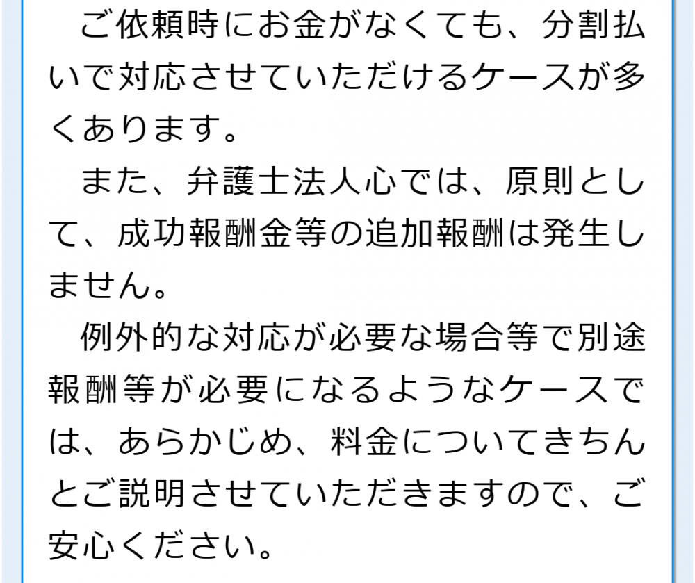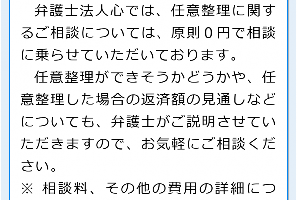 当法人では、借金の問題にお悩みの方が弁護士に相談しやすくなるよう、任意整理に関するご相談を原則無料で承ります。お問合せに関する情報はこちらをご覧ください。